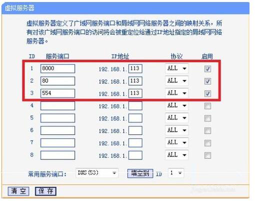 登陸路由器的配置界面,找到虛擬服務器(或者是端口映射),映射端口(設備默認80、8000、554三個端口,可在設備上修改,三個端口必須同時映射,缺一不可)